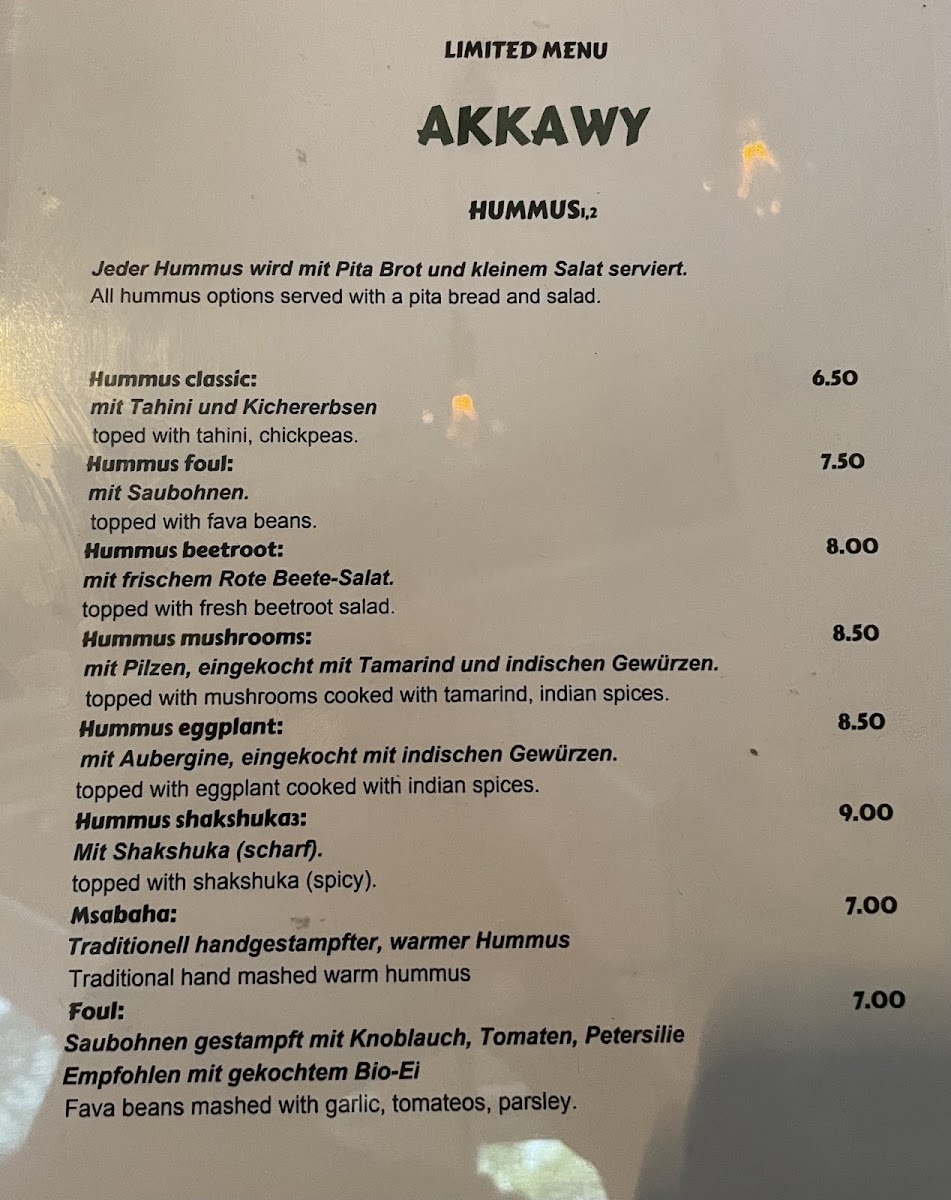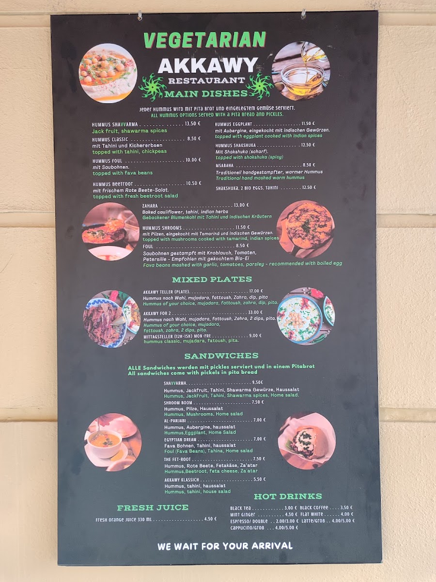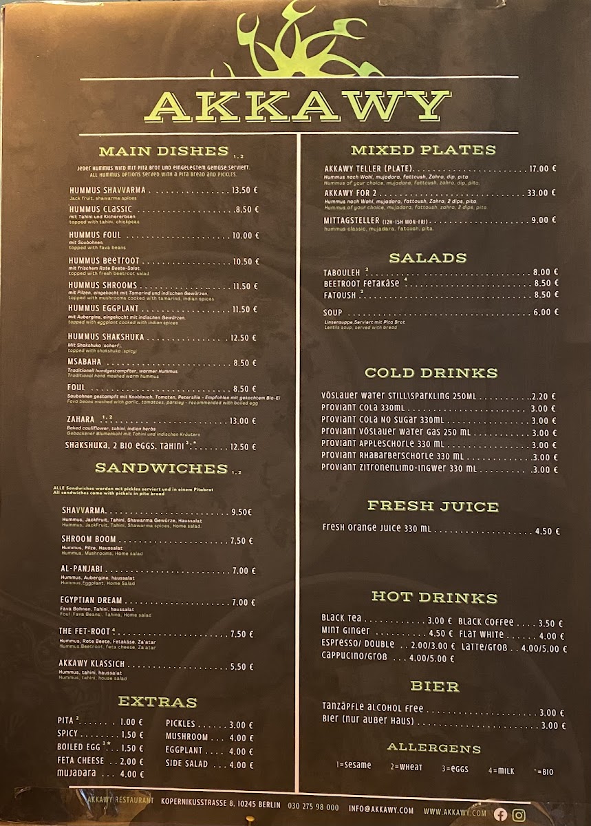 Welcome to Akkawy, a delightful vegetarian restaurant nestled in the heart of Berlin on Kopernikusstraße. This eatery is celebrated for its rich tapestry of flavors, intertwining elements of Northern African, Arabic, and Indian cuisines. The standout dishes, such as the Hummus Shawarma and Hummus Shakshuka, have garnered rave reviews for their vibrant taste and unexpected quality—many diners attest they couldn’t believe the dishes were vegan.